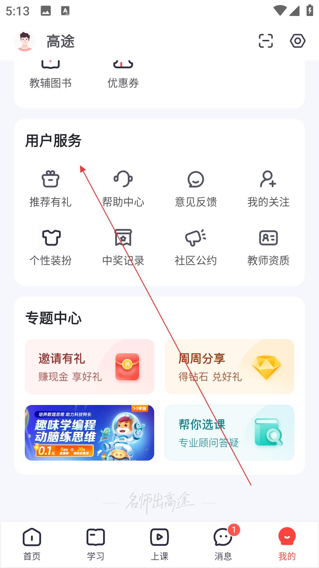 1、進(jìn)入我的頁面,可看到教輔圖書、優(yōu)惠券等板塊,還有用戶服務(wù)區(qū)域,包含推薦有禮、幫助中心等功能,點(diǎn)擊幫助中心。