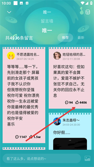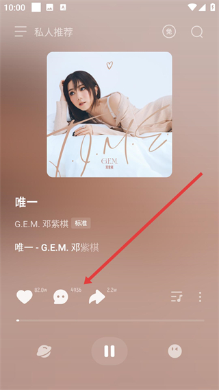 1、進(jìn)入歌曲播放頁面,看到留言相關(guān)圖標(biāo),點(diǎn)擊該圖標(biāo),進(jìn)入留言墻頁面。