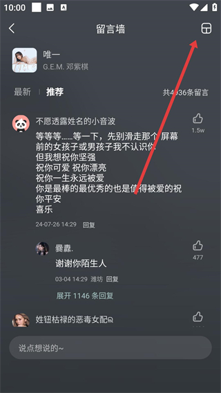 2、在留言墻頁面,看到右上角的留言墻圖標(biāo),點(diǎn)擊該圖標(biāo),切換留言展示視圖。