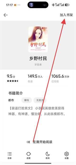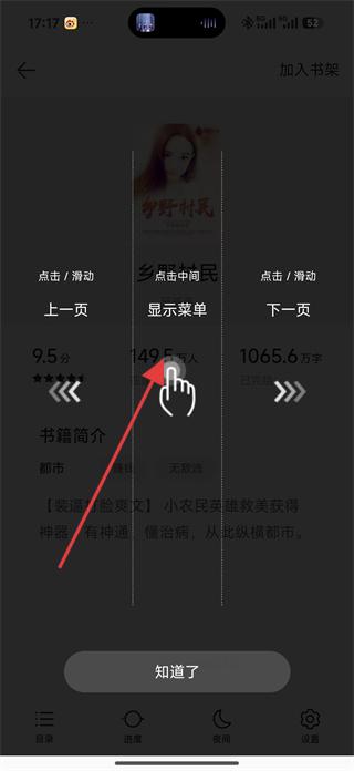4、在閱讀頁面點擊中間區(qū)域顯示菜單,可調整閱讀設置,若想收藏小說,點擊右上角加入書架按鈕,將小說加入書架。