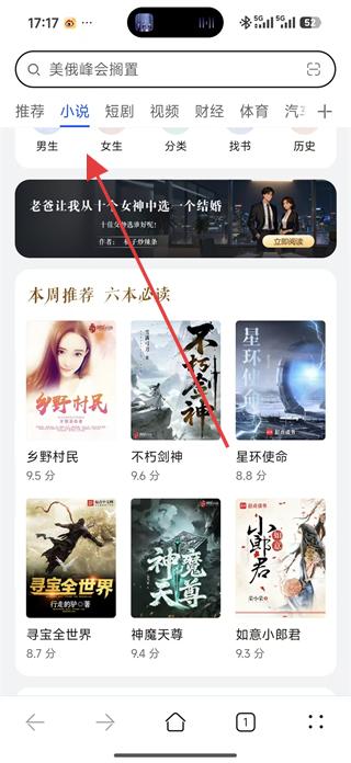 2、進入首頁點擊小說板塊,選擇男生分類,可看到本周推薦的小說列表,如鄉(xiāng)野村民等。