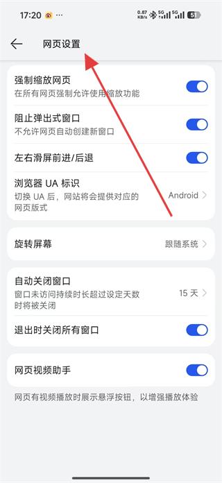 3、返回設(shè)置頁面,點擊網(wǎng)頁設(shè)置選項,可設(shè)置強制縮放網(wǎng)頁、阻止彈出式窗口等功能,根據(jù)需求開啟或關(guān)閉。