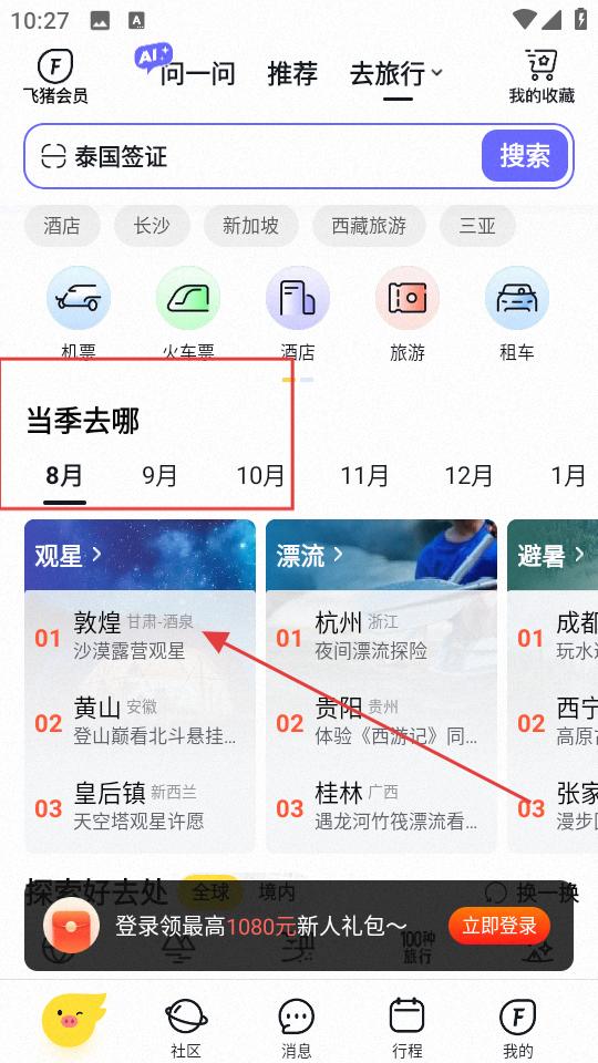1、打開飛豬APP進(jìn)入去旅行頁面,找到當(dāng)季去哪板塊,選擇8月等月份,瀏覽觀星漂流等主題推薦,點(diǎn)擊感興趣目的地如敦煌。