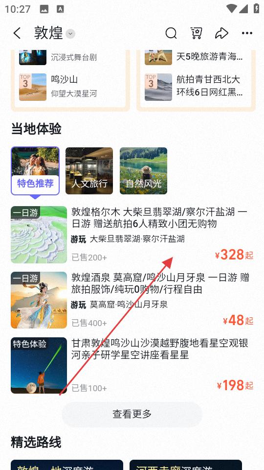 2、進(jìn)入敦煌頁面,查看當(dāng)?shù)伢w驗(yàn)項(xiàng)目,如敦煌格爾木大柴旦翡翠湖一日游,點(diǎn)擊該項(xiàng)目進(jìn)入詳情頁,了解行程與價(jià)格。