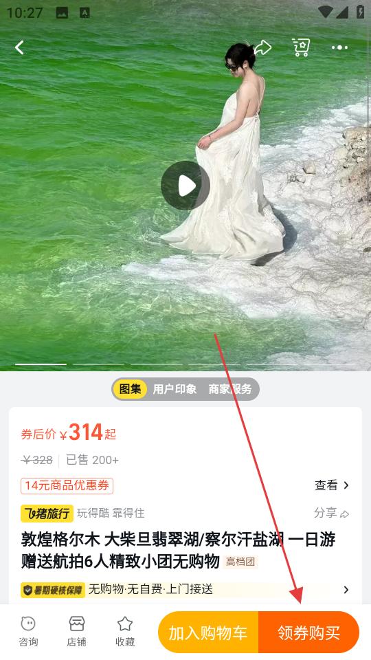 3、在項(xiàng)目詳情頁,確認(rèn)內(nèi)容后,點(diǎn)擊領(lǐng)券購買按鈕,按提示領(lǐng)券、填寫信息,完成支付,預(yù)訂該旅游項(xiàng)目。
