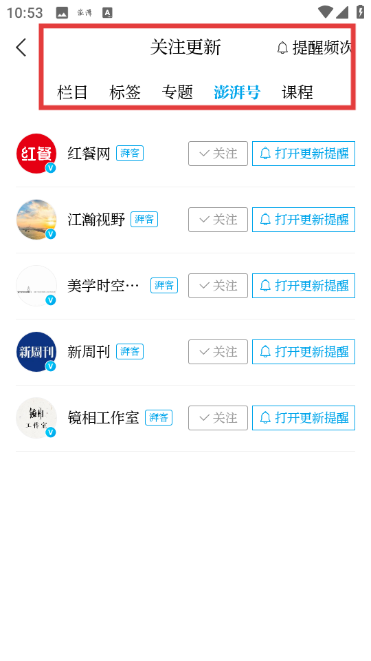 3、對于關(guān)注更新點擊進入后,可看到關(guān)注的欄目、標(biāo)簽等分類,針對不同分類能單獨設(shè)置是否接收更新提醒,點擊打開更新提醒按鈕關(guān)閉,就能精準(zhǔn)控制關(guān)注內(nèi)容的推送。