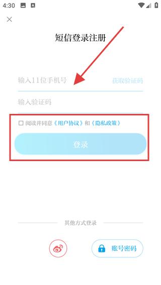 2、在登錄注冊選擇頁面若選擇短信登錄注冊,輸入11位手機號,獲取并輸入驗證碼,勾選閱讀并同意相關(guān)協(xié)議和政策點擊登錄。