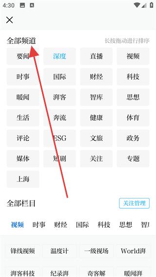 4、登錄成功后進入APP主界面,找到全部頻道入口,點擊進入全部頻道頁面,可查看要聞、深度等各類頻道,選擇感興趣的頻道瀏覽內(nèi)容。