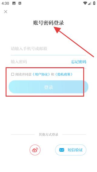 3、若選擇賬號密碼登錄輸入手機號或郵箱以及密碼,勾選閱讀并同意相關(guān)協(xié)議和政策,點擊登錄完成賬號登錄。