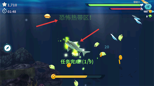 2、進(jìn)入恐怖熱帶區(qū)后,鯊魚可繼續(xù)捕食魚類,完成任務(wù)獲得獎(jiǎng)勵(lì),同時(shí)收集金幣,提升游戲收益。