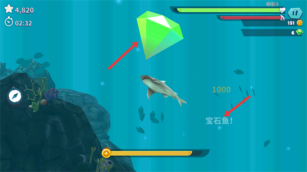 3、會(huì)出現(xiàn)寶石魚和綠色寶石等,鯊魚收集后可獲得大量分?jǐn)?shù)和資源,增強(qiáng)游戲體驗(yàn)。