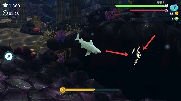 1、鯊魚在深海里可捕食各種魚類,包括帶有條紋的魚,通過捕食積累分?jǐn)?shù)和資源,推進(jìn)游戲進(jìn)程。