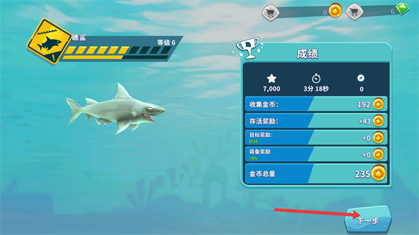 4、游戲結(jié)束后會(huì)顯示成績(jī)界面,查看收集金幣、存活獎(jiǎng)勵(lì)等數(shù)據(jù),點(diǎn)擊下一步可繼續(xù)游戲。