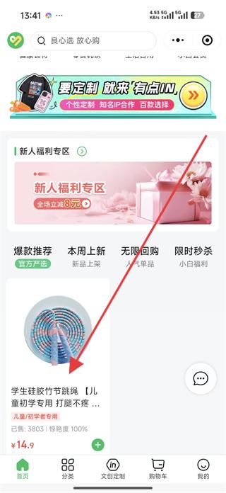 1、打開中青看點(diǎn)app,進(jìn)入首頁(yè)可瀏覽新人福利專區(qū)、爆款推薦等板塊,選擇學(xué)生硅膠竹節(jié)跳繩進(jìn)入商品詳情頁(yè)。