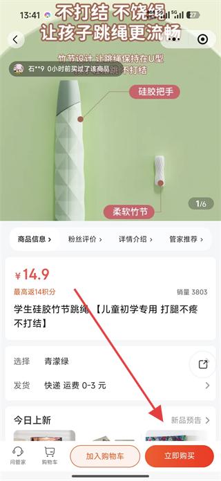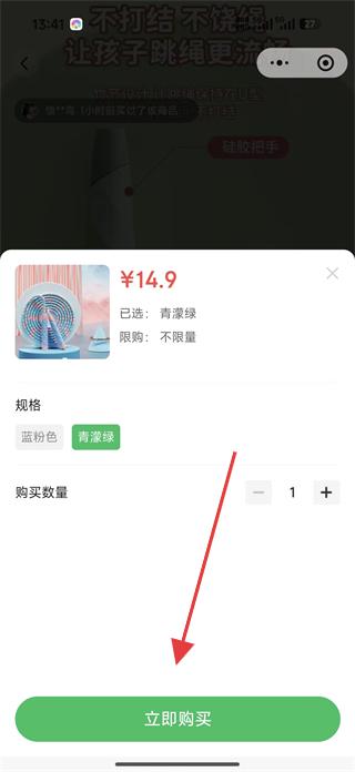 2、在商品詳情頁(yè)可查看商品價(jià)格、銷量、規(guī)格等信息,如青藻綠顏色,點(diǎn)擊立即購(gòu)買按鈕,進(jìn)入規(guī)格選擇頁(yè)面。