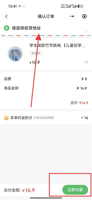 4、在確認(rèn)訂單頁(yè)面選擇收貨地址,查看商品金額、運(yùn)費(fèi)等信息,點(diǎn)擊立即付款按鈕,完成訂單支付購(gòu)買商品。