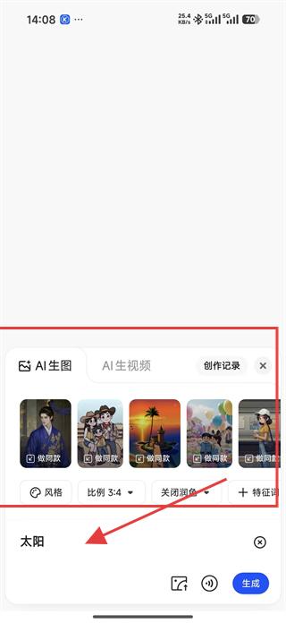 2、進入AI生圖頁面,在輸入框輸入創(chuàng)作主題,如太陽,還可選擇風(fēng)格、比例等參數(shù),設(shè)置完成后點擊生成按鈕。