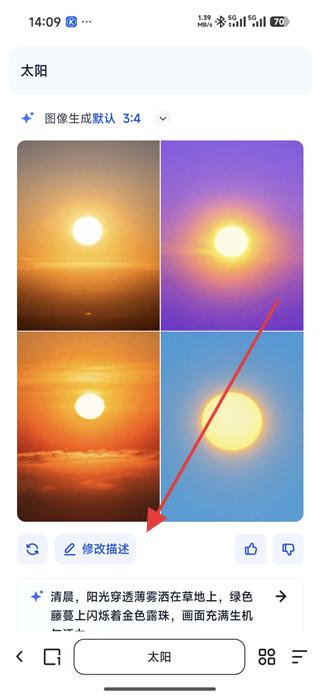 3、生成圖片后,若對效果不滿意,可點擊修改描述按鈕,調(diào)整創(chuàng)作描述內(nèi)容,重新生成圖片直到滿意為止。