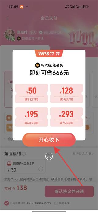 2、在會員支付頁面,會彈出WPS1111優(yōu)惠券窗口,點擊開心收下按鈕,領取滿減優(yōu)惠券。