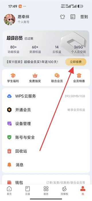 1、打開WPS軟件,點擊底部導航欄中的我選項,進入個人頁面后,找到超級會員板塊,點擊立即續(xù)費按鈕。