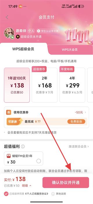 3、選擇WPS超級會員的套餐類型,如1年送100天套餐,然后選擇支付方式,如支付寶,點擊確認協議并開通按鈕。