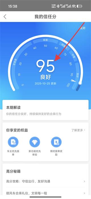 4、在個人資料頁面,點擊信任分選項,進(jìn)入我的信任分頁面,查看信任分?jǐn)?shù)值如95分,了解享有的權(quán)益。