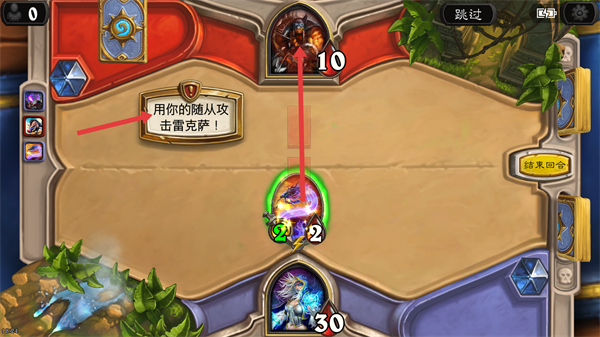 1、用己方的隨從攻擊敵方角色雷克薩,讓隨從發(fā)起進攻,對敵方角色造成傷害,推進對戰(zhàn)。