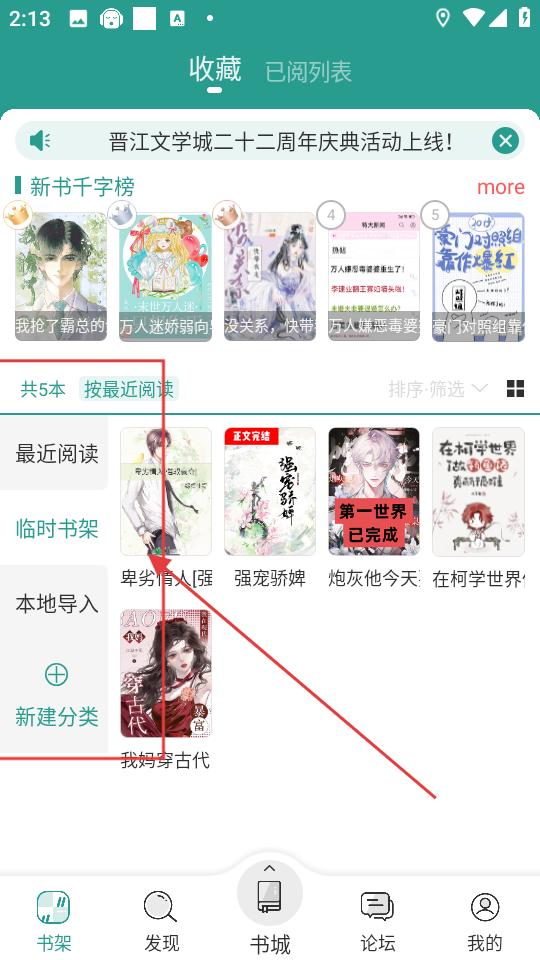 1、進入書架頁面,查看收藏作品,在最近閱讀、臨時書架等分類中,找到想閱讀的小說,點擊封面進入作品搜索或詳情頁。
