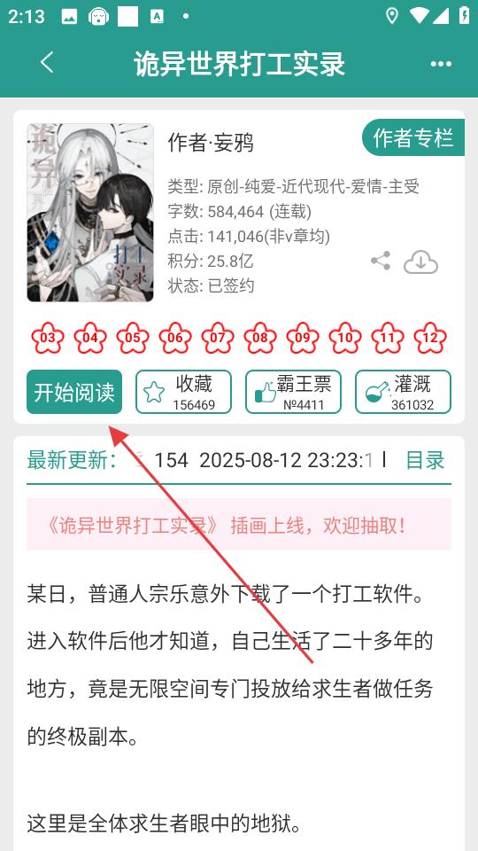 3、進入作品詳情頁,查看作品狀態(tài)、積分等內容,點擊開始閱讀按鈕,進入閱讀界面,開始瀏覽小說章節(jié)內容。