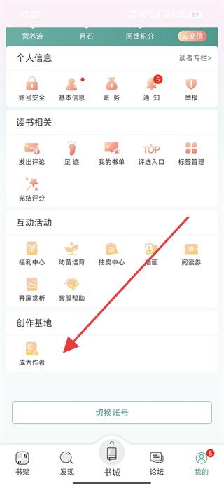1、進(jìn)入軟件我的頁面,瀏覽個(gè)人信息、讀書相關(guān)、互動(dòng)活動(dòng)等板塊,在創(chuàng)作基地中點(diǎn)擊成為作者,進(jìn)入注冊(cè)作者頁面。