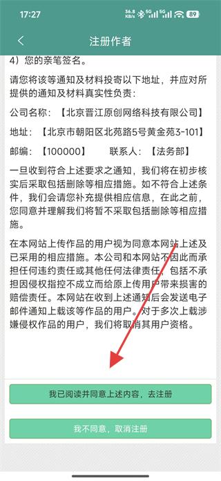 2、在注冊(cè)作者頁面,仔細(xì)閱讀相關(guān)條款后,點(diǎn)擊我已閱讀并同意上述內(nèi)容,去注冊(cè),進(jìn)入筆名填寫頁面。