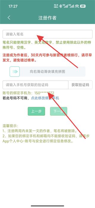 3、在筆名填寫頁面,輸入筆名,完成拼圖驗(yàn)證,獲取并輸入手機(jī)號(hào)碼驗(yàn)證碼,點(diǎn)擊下一步,完成作者注冊(cè)流程。