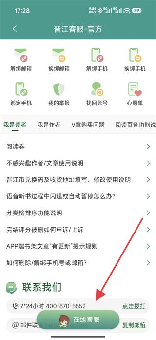 4、進(jìn)入晉江客服頁面,查看解綁郵箱、換綁手機(jī)等多種客服功能,若有疑問可點(diǎn)擊在線客服咨詢。