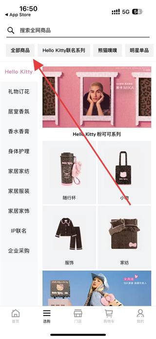 4、進入選物頁面查看全部商品分類,如HelloKitty粉可系列、居室香氛等,挑選感興趣的分類,如家居服、隨行杯等。