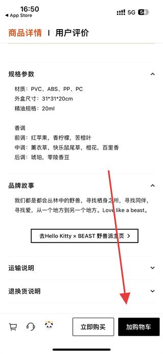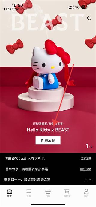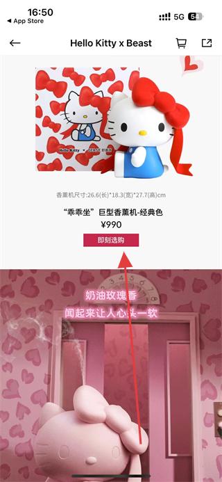 1、進入軟件首頁瀏覽HelloKittyxBEAST巨型香薰機,了解商品外觀與價格,點擊即刻選購,進入商品詳情頁,開啟聯(lián)名商品的選購體驗。