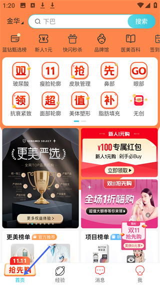 1、首頁(yè)定位金華有搜索功能,設(shè)藍(lán)鉆甄選榜、新人1元等板塊,涵蓋玻尿酸、皮膚管理等醫(yī)美項(xiàng)目,還有更美嚴(yán)選等推薦內(nèi)容。