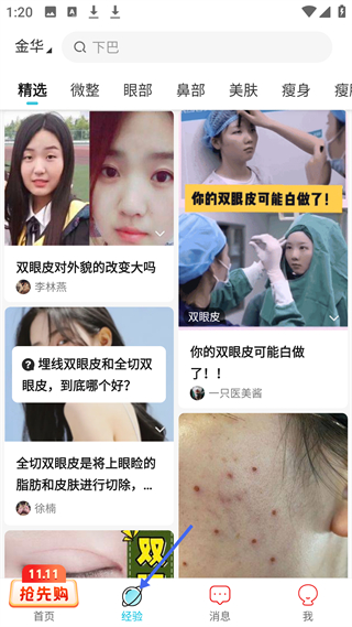 2、經(jīng)驗(yàn)頁(yè)面有精選、微整等分類,展示雙眼皮對(duì)外貌改變等醫(yī)美相關(guān)經(jīng)驗(yàn)分享內(nèi)容供用戶交流學(xué)習(xí)。