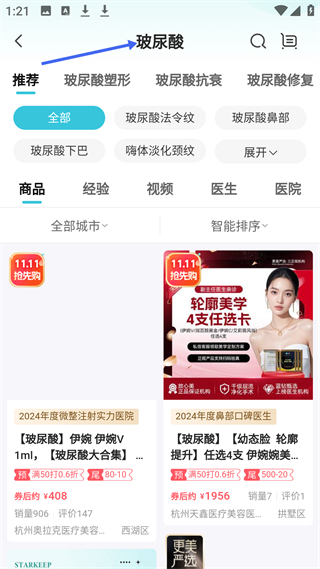 3、玻尿酸相關(guān)頁(yè)面有玻尿酸塑形、抗衰等分類,展示商品如伊婉玻尿酸等,標(biāo)注價(jià)格、銷量及醫(yī)院信息,助力用戶選擇。