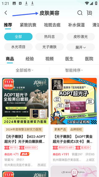 4、皮膚美容頁(yè)面含緊致抗衰、祛斑去痣等分類,展示AOPT超光子等皮膚美容項(xiàng)目,標(biāo)注價(jià)格、銷量及醫(yī)院信息方便用戶了解選購(gòu)。