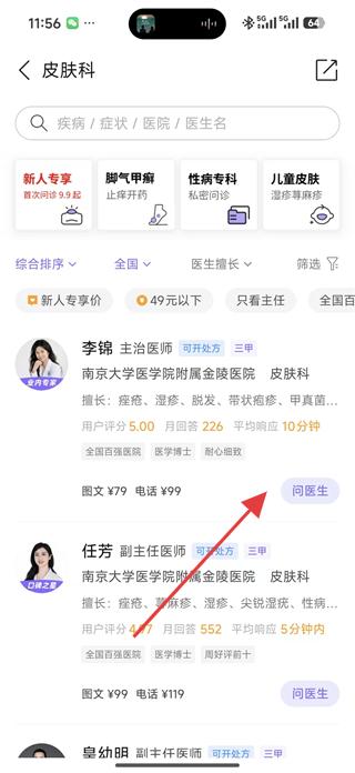 2、在皮膚科頁(yè)面可瀏覽醫(yī)生列表,如李錦主治醫(yī)師,查看醫(yī)生的擅長(zhǎng)領(lǐng)域、用戶評(píng)分等信息,點(diǎn)擊問(wèn)醫(yī)生按鈕,進(jìn)入醫(yī)生問(wèn)診頁(yè)面。