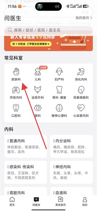 1、進(jìn)入問(wèn)醫(yī)生板塊可查看常見科室如皮膚科、兒科等,選擇需要問(wèn)診的科室,如皮膚科,進(jìn)入科室詳情頁(yè)面。