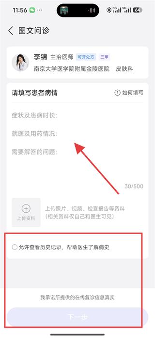 4、在圖文問(wèn)診頁(yè)面填寫患者病情,包括癥狀及患病時(shí)長(zhǎng)、就醫(yī)及用藥情況、需要解答的問(wèn)題等,上傳相關(guān)資料,等待醫(yī)生回復(fù)。