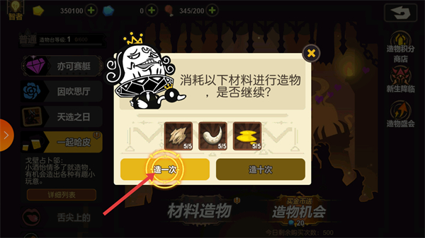 1、可消耗材料進行造物,選擇造一次或造十次,造物可獲得新的怪獸或道具,提升陣容實力。