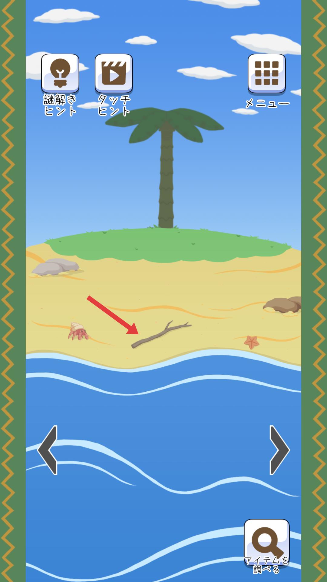 2、進(jìn)入游戲場景后,在沙灘區(qū)域,看到樹枝,點擊拾取樹枝,將其收入物品欄,為后續(xù)解謎或操作做準(zhǔn)備。