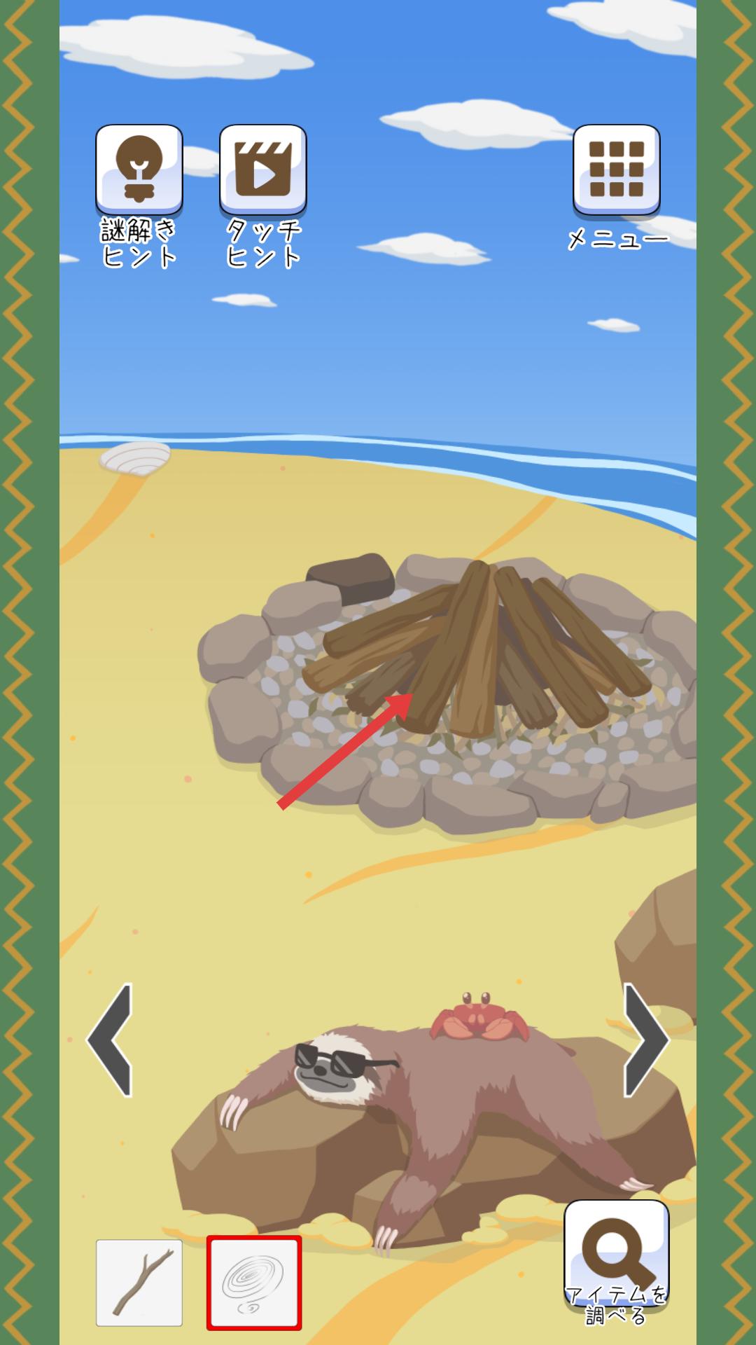 3、在沙灘的篝火堆處,點擊篝火堆,可進(jìn)行與篝火相關(guān)的互動,結(jié)合已拾取的物品,推進(jìn)游戲內(nèi)的劇情或解謎進(jìn)程。
