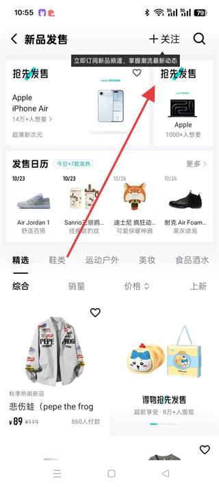 4、點(diǎn)擊關(guān)注按鈕,掌握新品最新動態(tài),同時(shí)可瀏覽發(fā)售日歷和精選商品,選擇心儀商品進(jìn)行關(guān)注或購買。