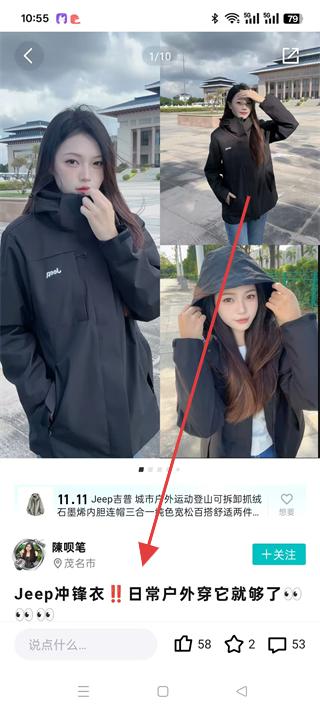 3、在穿搭分享頁面,可查看用戶分享的Jeep沖鋒衣等穿搭內(nèi)容,點(diǎn)擊關(guān)注按鈕,關(guān)注穿搭達(dá)人,獲取更多穿搭靈感。
