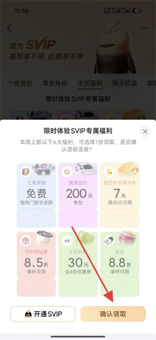 3、點擊立即領取后彈出限時體驗SVIP專屬福利確認窗口,點擊確認領取進入后續(xù)領取流程。