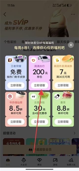 2、在福利選擇界面可看到每周6選1的SVIP專屬福利,選擇心儀的福利,比如滴滴出行200元券包點擊立即領取。