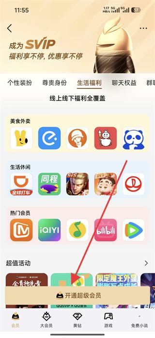 1、進入成為SVIP相關頁面,在頁面中找到開通超級會員按鈕,點擊該按鈕進入福利選擇界面。